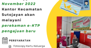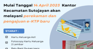 Untuk memberikan kemudahan dan kecepatan Pelayanan Adminduk, maka mulai tanggal 14 April 2023 Masyarakat Kecamatan Sutojayan yang mengajukan Perekaman e-KTP bisa melaksanakan Perekaman e-KTP dan Mengajukan e-KTP Baru di Kantor Kecamatan Sutojayan setiap hari kerja mulai Senin – Kamis jam 08.00 WIB s/d 15.00 WIB dan Jum’at jam 08.00 WIB …